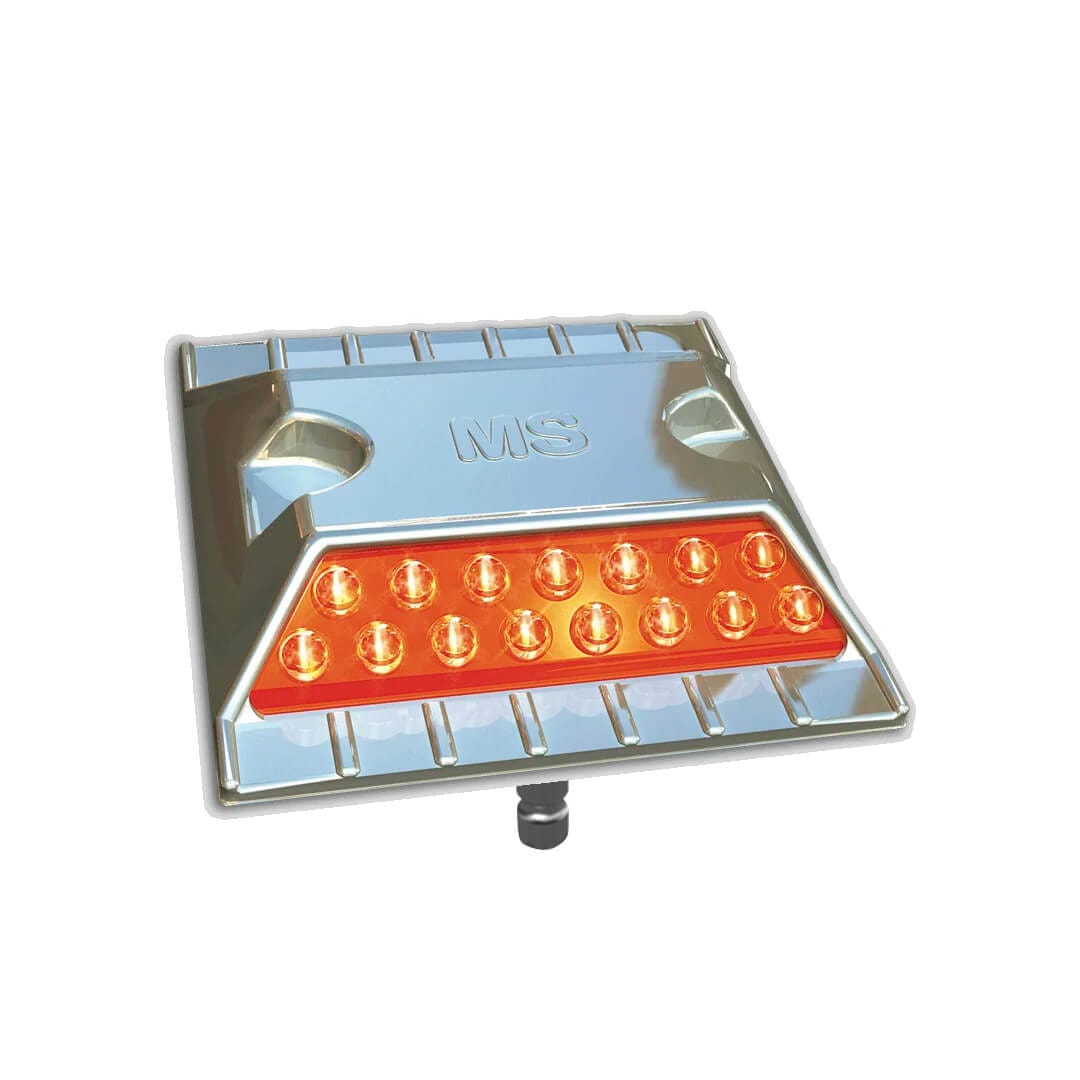 Fabricada en acero inóxidable. Alto poder reflejante. Alta resistencia a impactos. Gran funcionalidad en autopistas y vías de un solo sentido. Incluyen perno para mejor sujeción. Color de reflejante en: Ambar. Medidas: Largo:10.0 cm, Ancho:10.0 cm. H: 2.0 cm. Con uno o dos lados reflejantes de esferas, con perno una cara.